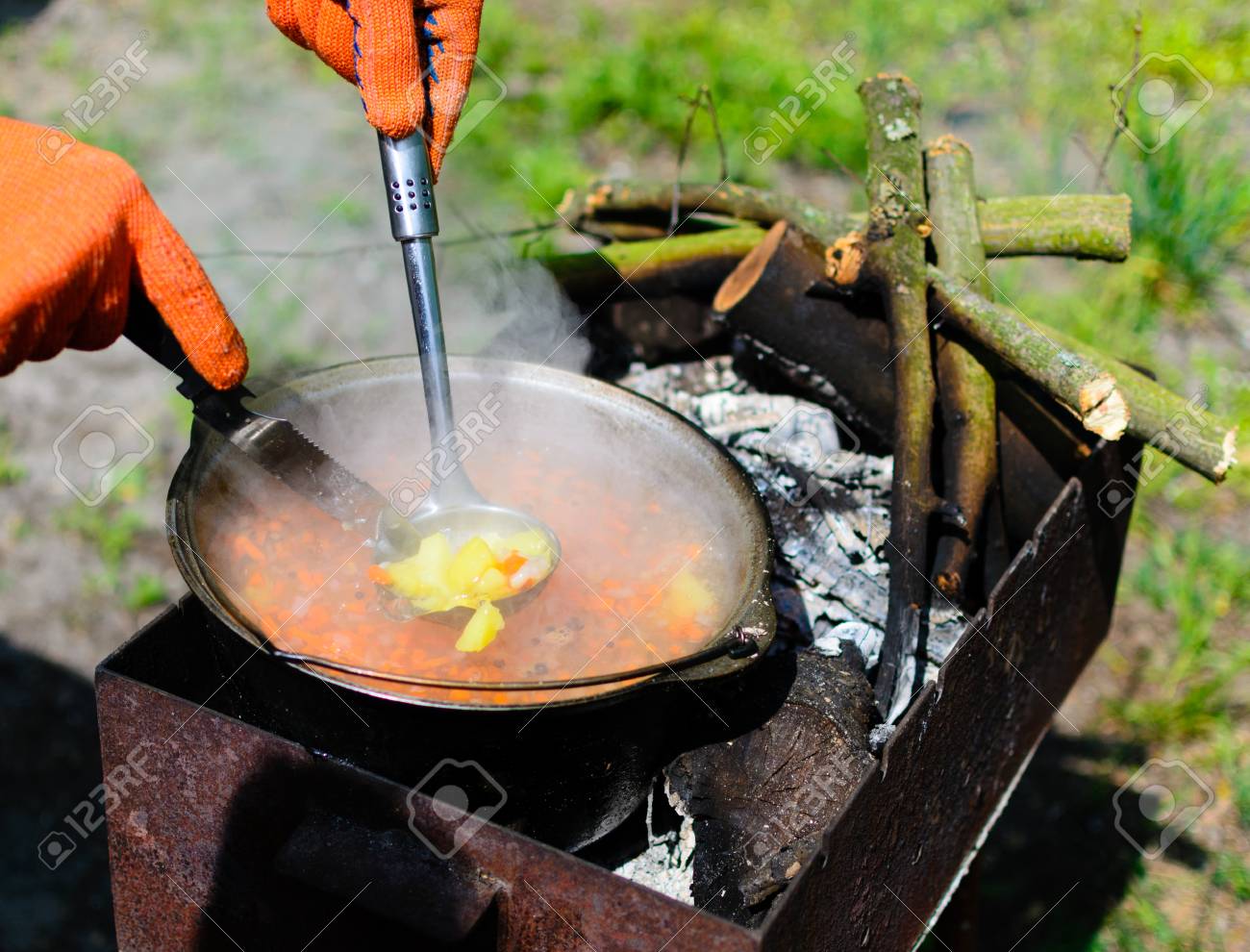 26+ Cooking In Nature, Gif. About cooking breakfast in nature. Young friends having barbecue party, outdoors.